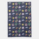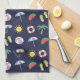 Serviette de cuisine à thème bleu foncé de vacances avec collage de plage illustrée coloré.