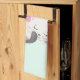 Serviette de cuisine avec une adorable illustration graphique. Un chaton blanc avec une jolie image empreinte de patte sur sa fourrure. Dormir tranquillement. Un grand coeur rose derrière elle et quelques petites étoiles aussi. Arrière - plan vert menthe.