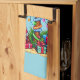 Une serviette de cuisine avec une image de vacances saisonnière. Un palmier tropical orné de lumières festives surmonté d'une étoile. Un sucre de canne géant rouge et blanc qui sort du sable. Cadeaux de Noël sous l'arbre. Whimsical et amusant.
