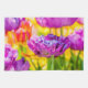 Violet coloré, violet, tulipes roses sur un lit à fleurs. Presque toutes les couleurs arc-en-ciel présentes. Scène florale lumineuse et positive. Photographie macro.