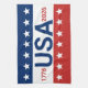 Celebrating the USA's 250th anniversary. This red, white, and blue kitchen towel has the word 'USA' in the center. The years 1776 and 2026 are next to USA. The top stripe is blue and has white stars. The center stripe is white. The bottom stripe is red with white stars.