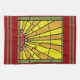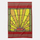 Serviette de cuisine de 16" x 24" avec une image de vitrail Art Déco avec rayons dorés de lumière émanant d'un soleil rouge-orange. Bordures à bandes rouges et vertes. Voir la serviette en tissu assortie, la serviette en papier, le set de table en tissu, le set de table en papier et les dessous de verre. Voir l'ensemble de la collection Roaring 20s Kitchen Towel dans la NOURRITURE/BEV | Section Linge.