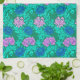 Serviette de cuisine dans un vintage William Morris, Art Nouveau, imprimé floral de chrysanthèmes stylisés, numériquement rehaussés et colorés, dans les tons doux aqua et bleu turquoise cérulean, et violet / lavande, sur un arrière - plan turquoise / paon