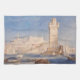 Rhodes. Joseph Mallord William Turner (1775 - 1851). Un beau paysage marin dans les tons rose et bleu. Au premier plan se trouvent des bateaux et des bateaux dans la baie près des remparts de la ville. au milieu se trouve une haute tour. Dans l'arrière - plan il y a une ville avec des maisons en pierre. Reproduction d'oeuvres d'art célèbres dans le domaine public.