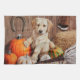 Un chiot de récupération du Labrador jaune se trouve parmi une récolte d'automne de citrouilles, de gourdes, de maïs indien et d'une balle de foin. Et le mur de la grange en bois de l'arrière - plan est décoré d'un vieux fer à cheval rouillé et de plumes de dinde. OEuvre d'art réaliste créée à partir d'une peinture à l'huile originale de l'artiste animalière Crista S. Forest.