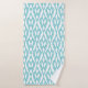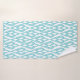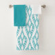 Ce kit de serviettes est muni d'un linge blanc, d'une serviette de bain turquoise et d'une serviette de bain au design Art Déco de diamants reliés par des lignes courbes en turquoise.