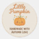 Adorable fall-themed “Little Pumpkin” sticker featuring a cute smiling pumpkin illustration. Perfect for baby showers, handmade product packaging, thank you tags, and autumn gifts. The soft beige background and warm orange tones capture cozy autumn vibes, making it ideal for seasonal crafts and decorations