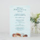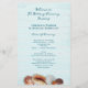 Programme de mariage pour les mers vivantes imprimé sur papier abordable. Customisez le texte des deux côtés sur une image en bois bleu clair. A l'avant, le fond a des coquillages réalistes et un dollar de sable. Le texte est de couleur bleu marine et alterne entre le script et les polices imprimées. De l'espace est donné à l'arrière pour un court message du couple. Le papier a une taille de 5,5 x 8,5.