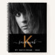 Un arrière - plan noir chic. Personnalisez et ajoutez votre propre photo, un nom, une lettre monogramme et une année. Le nom est écrit en blanc avec un grand script de style à la main moderne avec des swashes. Lettre monogramme d'or. Pour l'école, travaillez comme un carnet de croquis, un journal intime et un journal. Pour que les swashes ne suppriment que le nom de l'échantillon, laissez les espaces ou les émoticônes devant et après le nom