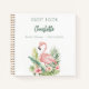 Un arrière - plan blanc décoré d'un flamant rose et de fleurs tropicales et de feuillage. Personnalisez et ajoutez un nom et un texte/une date.
