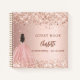 Un livre d'or pour une Quinceañera féminine et glamour, 15e anniversaire fête. Un arrière - plan rose élégant à l'aspect faux métallique avec fausse parties scintillant, pétille et une fille portant une robe de princesse, robe de bal. Personnalisez et ajoutez votre nom et votre âge/date. Le nom est écrit avec un script de style écrit à la main.