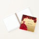 Pour une Quinceañera, fête du 15e anniversaire. Un arrière - plan en faux or avec de la poussière de parties scintillant, une robe et des roses rouges, des fleurs. Le nom est écrit avec un script de style moderne écrit à la main. Personnalisez et ajoutez un nom et une date.