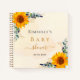 Brosse dorée couleur eau se dessine comme arrière - plan. Décoré de tournesols, de verdure d'eucalyptus et de feuillage doré. Ajoutez un nom et une date.