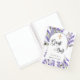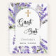 Un élégant arrière - plan blanc décoré d'un cadre en arc de cercle de fleurs de lavande violette et d'une croix dorée. Personnalisez et ajoutez un nom et un titre/événement. Le livre d'hôtes est écrit avec une écriture élégante à la main.