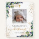 Pour un baptême élégant, neutre du genre. Un arrière - plan blanc chic, décoré de verdure d'eucalyptus, de poussière de parties scintillant en faux or et d'une croix dorée. Personnalisez et ajoutez une photo de taille carré sur le devant, le nom de l'enfant et la date du baptême. Lettres noires et dorées. Retour : ajoutez vos propres 3 photos au dos, nom et date de naissance. Images de taille verticale (taille de portrait)