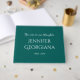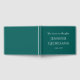 Ce livre d'or minimaliste sur les funérailles et commémorations comporte le message "Vous êtes dans nos pensées", ainsi que le nom et les dates de naissance et de décès de l'individu qui est passé. Il a du texte blanc sur un arrière - plan turquoise foncé. Il pourrait être utilisé pour enregistrer de bons souvenirs de quelqu'un qui est récemment décédé.