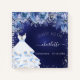Pour une Quinceañera, fête du 15e anniversaire. Un arrière - plan bleu marine aux parties scintillant faux argentées brille, une robe blanche et bleue et des fleurs bleues. Le nom est écrit avec un script de style moderne écrit à la main. Personnalisez et ajoutez un nom et une date.