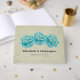 Un livre d'or mariage avec un trio simple de roses turquoises peint d'aquarelles. L'Arrière - plan est un motif de damas tanné.