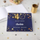 Bleu marine tendance, arrière - plan de couleur inégale avec des étoiles faux or. Ajoutez votre photo, votre nom et votre texte. Le numéro d'âge est écrit avec une police de style ballon. Épine : ajoutez votre texte.