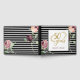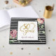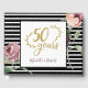 Elégant et chic livre d'anniversaire du 50e mariage avec des roses d'aquarelle rouge sur arrière - plan rayé noir et blanc. Design de texte élégant en or et fausse parties scintillant.