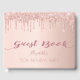Un livre d'or pour une fête de 50e anniversaire girly et glamour. Un arrière - plan d'or faux rose avec une élégante parties scintillant d'or faux rose gouttes, peinture goutte à goutte. Le texte : Le nom et le titre : Livre d'hôtes sont écrits en or rose foncé avec un script de style manuscrit moderne. Tempérer pour une date et l'âge 50.