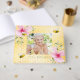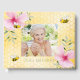 Pour un 70ème anniversaire d'été. Jaune, arrière - plan blanc avec un motif de nid d'abeille. Décoré de fleurs tropicales roses, d'hibiscus et d'abeilles jolies. Ajoutez votre propre photo et l'âge 70. Lettres de couleur verte. Épine : ajoutez votre propre texte. Retour : motif honecomb et une joyeuse bumble bee.