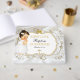 Belle petite fille dans sa robe de baptême et son collier de croix d'or. Arrière - plan est satiné blanc avec cadre de parties scintillant or et argent et embellissement arc. Le dos est orné de ruban doré sur un arrière - plan satiné blanc.