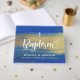 Élégant livre d'invité Baptism classique bleu et or avec peinture abstraite or et bleu arrière - plan, "Baptême" script de calligraphie en blanc et détails dans les lettres modernes bloc. Parfait pour célébrer le baptême.