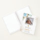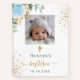 Pour un baptême élégant. Un fond blanc chic, décoré d'une rose bleu clair, de verdure d'eucalyptus, de paillettes dorées fausses et d'une croix dorée. Personnalisez et ajoutez une photo de format carré sur le devant, le nom de l'enfant et la date du baptême. Lettres noires et dorées.