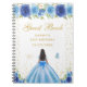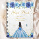 Ce livre d'or élégant et glamour présente une belle princesse aux cheveux foncés et à la peau foncée dans une robe bleue. Le texte combine écriture manuscrite et polices sans serif modernes pour un look élégant et sophistiqué. Les compositions florales, les papillons et les confettis d'or créent un mélange parfait de rustique et de chic. Graphiques par www.etsy.com/uk/shop/SunflowerDayLove