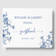 The classic blue floral frame paired with a clean white background creates a sophisticated design that complements many wedding styles, including garden weddings, classic celebrations, vintage themes, and elegant formal events.