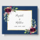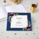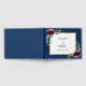 Un élégant livre d'hôtes moderne décoré de roses aquarellés en bordeaux avec plumes et verdure. Avec un faux cadre doré et blanc. Arrière - plan bleu marine. Modèles pour vos noms et date mariage. Les noms sur le devant sont écrits avec un script de style à la main moderne et tendance. Lettres de couleur noire. Ajoutez votre texte sur la colonne vertébrale. Texte doré Retour : arrière - plan bleu marine.