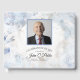 Personnalisez l'élégant livre d'invités de la Célébration de la Vie de l'oeillet bleu pour les participants à votre service commémoratif, de réveil ou funéraire à signer. Customisez-le avec le nom de votre être cher décédé, la photo, l'anniversaire et le jour du décès. Cet élégant livre d'hôtes fleuri personnalisé présente une jolie photo florale peinte en aquarelle numériquement de pétales de fleurs de carnation blanche, aux teintes bleu clair.