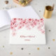 Pretty pink watercolor cherry blossoms on a white background. Custom bride and groom names in an elegant handwritten script.