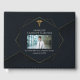 Ce livre d'invité chic de l'école de médecine noire présente un design hexagone géométrique or avec un élégant cathétrique au-dessus d'une photo du diplômé. Un livre d'or photographique moderne pour un nouveau médecin ou une nouvelle infirmière en 2025.