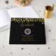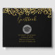 Un livre d'or qui dit Classe 20xx et le nom et l'école du diplômé, écrit en or. Conçu avec un capuchon de graduation noir entouré d'un cercle blanc semi-transparent. Le bord supérieur est décoré de faux confettis de parties scintillant en or. Arrière - plan noir avec lettrage or est simple mais élégant.
