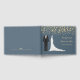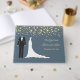 Confetti doré, smoking et robe mariage dressée contre un arrière - plan gris bleu Livre d'or