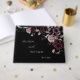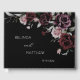 This dark floral romantic wedding guest book features watercolor painted dark roses, bride and groom name in an elegant modern font and handwritten script.