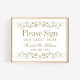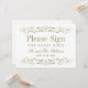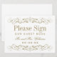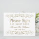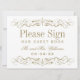 Guidez vos invités à signer avec ce panneau "Veuillez signer notre livre d'or" à motif de volutes en or vieilli. Des bordures de filigrane ornementales encadrent la typographie élégante, avec un espace pour le nom du couple et la date du mariage pour une touche personnelle. La palette classique d'or sur fond blanc et le design intemporel de volutes s'harmonisent parfaitement avec la suite de papeterie complète. Tout le texte est entièrement personnalisable.