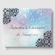 Un livre d'hôtes élégant et design pour la réception (ou qui conviendra aussi à tout autre événement) aux jolies couleurs pastel bleues, roses et violets. Il y a de minuscules taches de parties scintillant et des étincelles (faux) dans la motif, et un ornement noir damassé très décoratif dans le coin supérieur gauche sur l'avant.