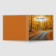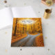 Une scène forestière sereine capture un sentier sinueux qui se divise en deux au milieu d'arbres imposants ornés de feuilles dorés et dynamiques. Le texte peut être modifié.