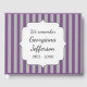 Ce livre d'hôtes présente des rayures violettes et grises, ainsi qu'un nom personnalisé et des années de naissance et de mort. Il pourrait être utilisé pour enregistrer les participants à des funérailles, et tous les grands souvenirs qu'ils ont de l'individu récemment décédé.