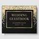 Elegant black and gold wedding guest book with gold confetti. Easily personalize this template online. Matching items available to complement this modern wedding guest book.