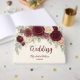 Welcome loved ones with a sophisticated reception keepsake featuring deep crimson, blush, and ivory botanical arrangements over a subtle wash background.This classic stationery design features an asymmetrical floral border framing the primary layout, composed of dark red , soft blush, and creamy ivory blossoms. Muted sage green foliage provides visual balance and soft drop-shadowing against a subtle, faux-painted background wash. The typographic hierarchy utilizes a sweeping, traditional calligraphy script for primary names, anchored by a refined, highly legible classic serif font for secondary details.This is a flat printed image with a printed watercolor effect, not actual raised material.