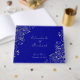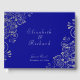 Une belle et élégante façon de se souvenir des invités qui ont assisté à votre mariage et réception. Sur un arrière - plan bleu, des tourbillons gris argenté, des fleurs et des figuiers s'organisent en cascade autour des coins et sur les côtés. Vos noms sont dans une police de script mariage élégante. Ajoutez vos prénoms et la date du mariage. Placez vos prénoms sur la colonne vertébrale. Un excellent choix pour un mariage d'hiver classique. Demandez à vos invités non seulement de signer leur nom, mais aussi d'envoyer leurs conseils et leurs meilleurs voeux.