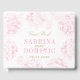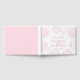 Le design élégant des livres d'hôtes mariages comprend du texte monogramme sur mesure rose et or encadré par de belles fleurs de pivoine rose pâle. Un motif géométrique coordonné blanc et rose clair apparaît sur le dos.
