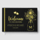 Élégant livre d'hôtes en feuille d'or et noir personnalisé avec des noms de couple et monogramme initial sur un bocal de maçon avec des fleurs sauvages.
