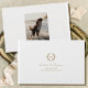 Invitation tes invités à écrire leurs messages spéciaux et leurs souvenirs amusants dans ce livre d'invités mariage personnalisé. Un design élégant avec les initiales monogrammes du couple à l'intérieur d'une couronne de laurier et une photo préférée au dos. Une combinaison simple et élégante de scénario classique serif et calligraphie, en blanc et or.