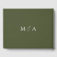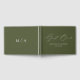 Elégant livre d'or de mariage avec "Guest Book" présenté dans un script moderne de calligraphie blanche sur un arrière - plan vert olive. Personnalisez l'avant du simple livre d'hôtes mariage avec vos noms et votre date de mariage. Le fond du livre d'hôtes vert olive affiche vos initiales monogrammes. Ajoutez votre nom et votre date de mariage à la colonne vertébrale du livre d'or.