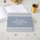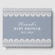 Elégante dentelle blanche, recouverte d'une bordure sur un arrière - plan bleu poussiéreux. Customisez le livre d'hôtes avec le nom de la future maman et la date du baby shower.